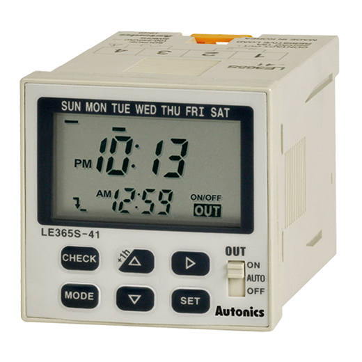 The LE365S-41 digital week/year timers allow time configuration and control in week or year units. Simple configuration and status monitoring is possible with weekly timer programming up to 48 steps and yearly timer programming up to 24 steps. Various user convenience functions are available including daylight savings time function. The timers feature a built-in independent relay control output.